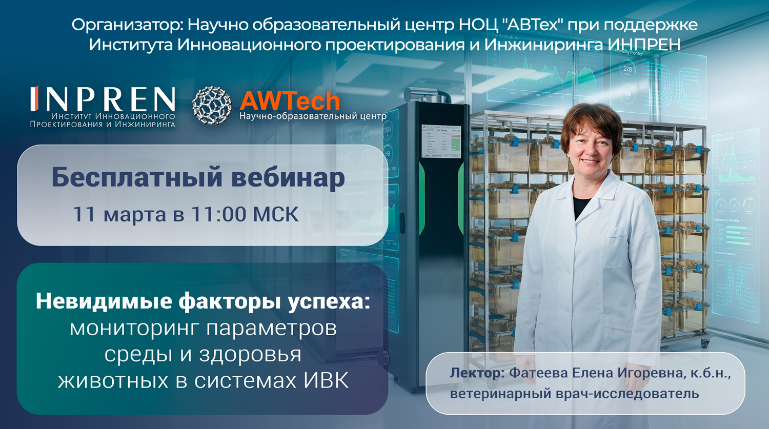 11 марта 2026 г. Научно образовательный центр НОЦ "АВТех" при поддержке Института Инновационного проектирования и Инжиниринга ИНПРЕН проведет бесплатный вебинар к.б.н. Елены Игоревны Фатеевой «Невидимые факторы успеха: мониторинг параметров среды и здоровья животных в системах индивидуально-вентилируемых клеток (ИВК)» .