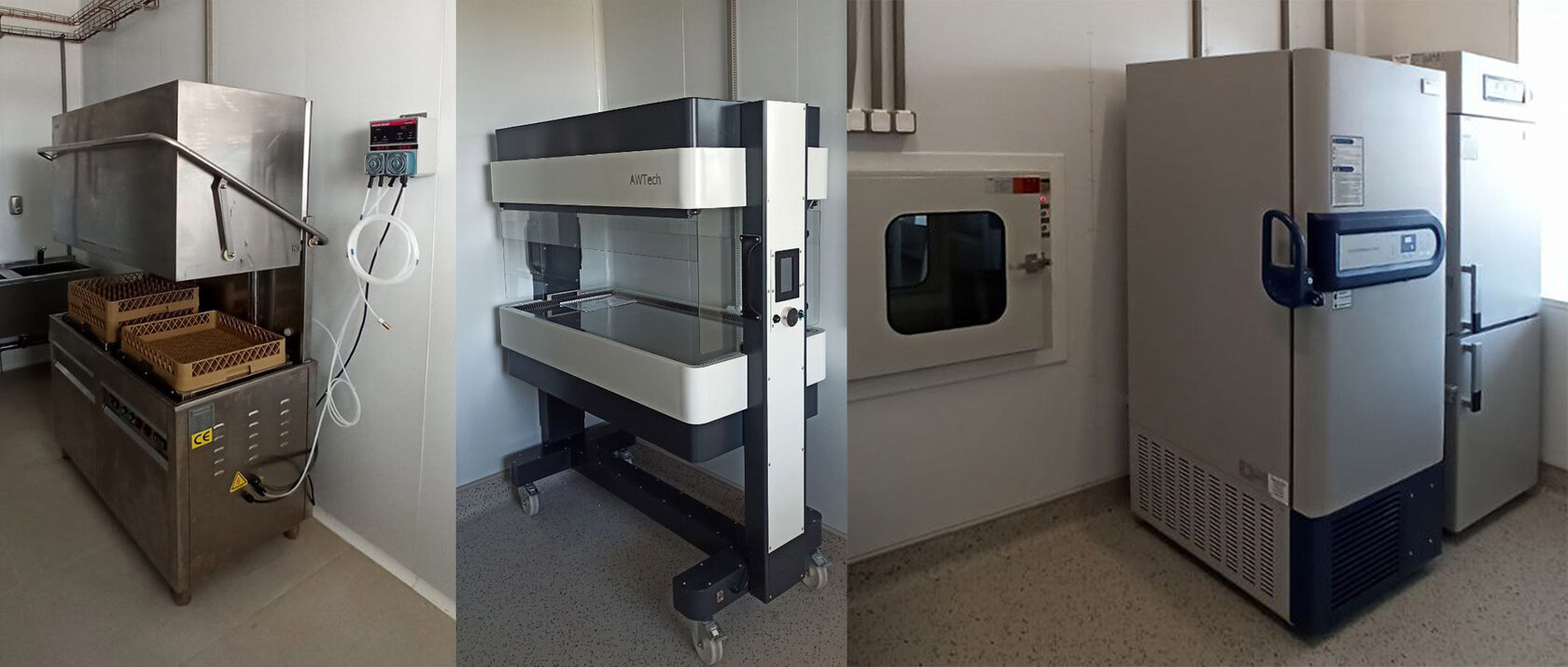 На фото (слева на право): моечная машина для мытья клеток INEO DW-Y1360, универсальная ламинарная станция AWTech ПРОМЕТЕЙ, передаточное окно 3W KS1, низкотемпературный морозильник Haier Biomedical DW-86L338, фармацевтический холодильник Haier Biomedical HYCD-469.